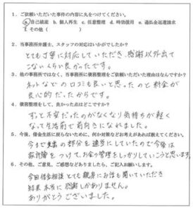 提出書類が間に合わなかった際、期限を延長していただきありがとうございました。不許可事由がありましたが、免責になるよう助けて下さりありがとうございました。借金が無くなった事で、生活のやり直しが出来ています。大学に入り直して資格を取り、転職先で自分のペースで生きていきます。